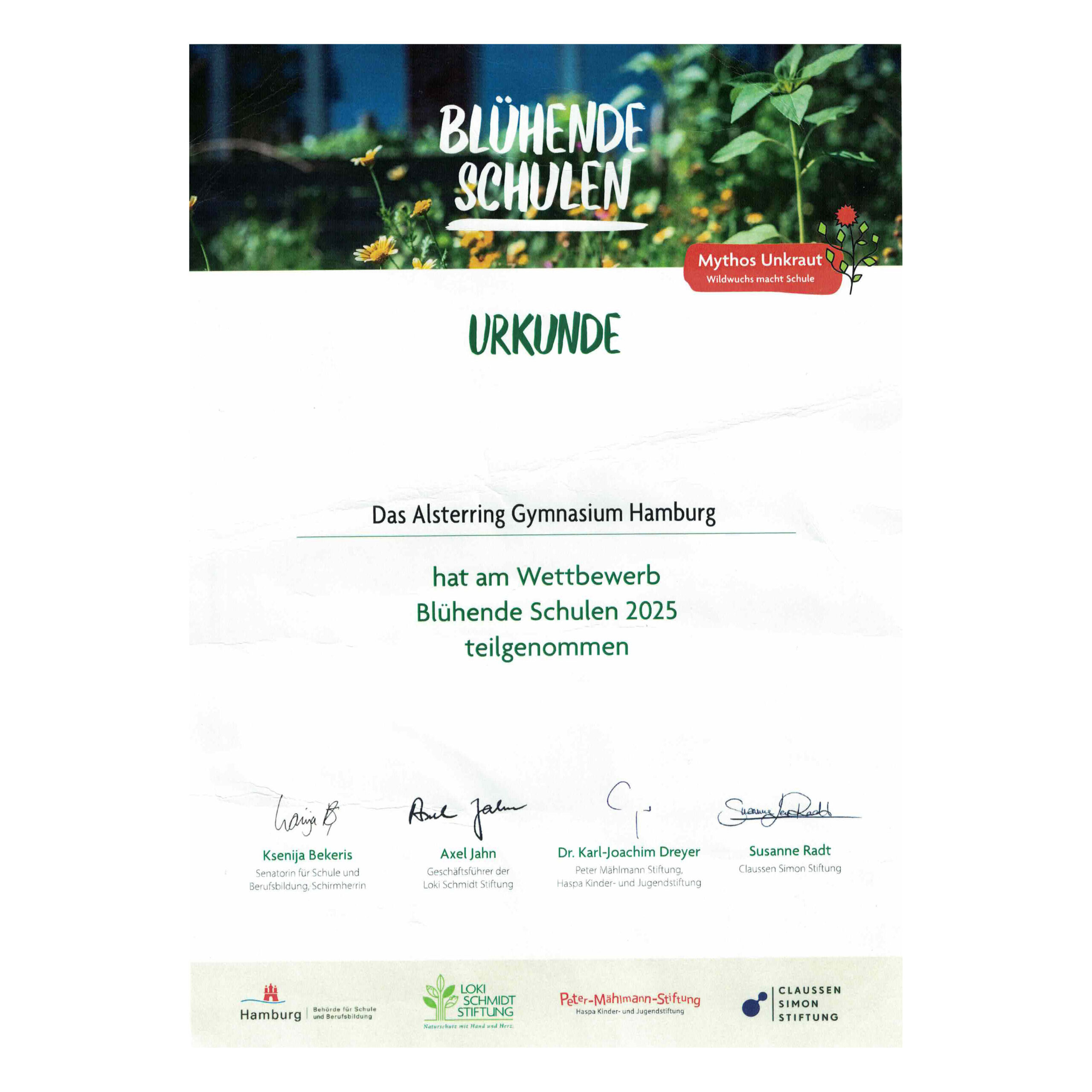 Mit Freude haben sich unsere Schüler:innen zusammen mit einer engagierten Biologie-Lehrkraft intensiv der Gestaltung unseres Schulgartens gewidmet. Dafür wurde unserer Schule nun eine Urkunde des Wettbewerbs „Blühende Schulen 2025“ verliehen, die u. a. von unserer Schulsenatorin wie auch dem Geschäftsführer der Loki Schmidt Stiftung unterzeichnet wurde. Wir danken für den Einsatz!